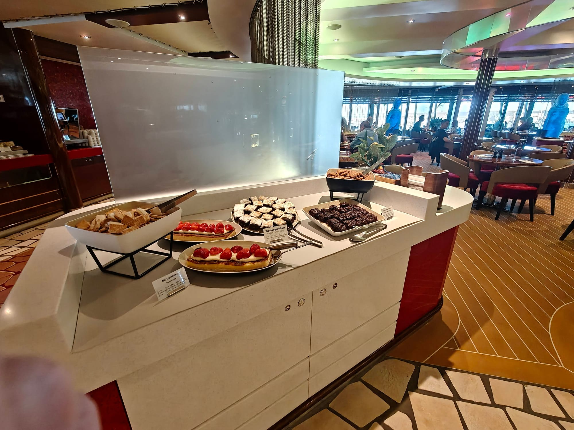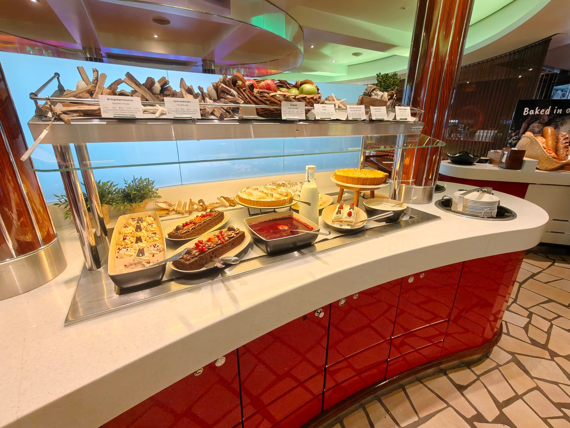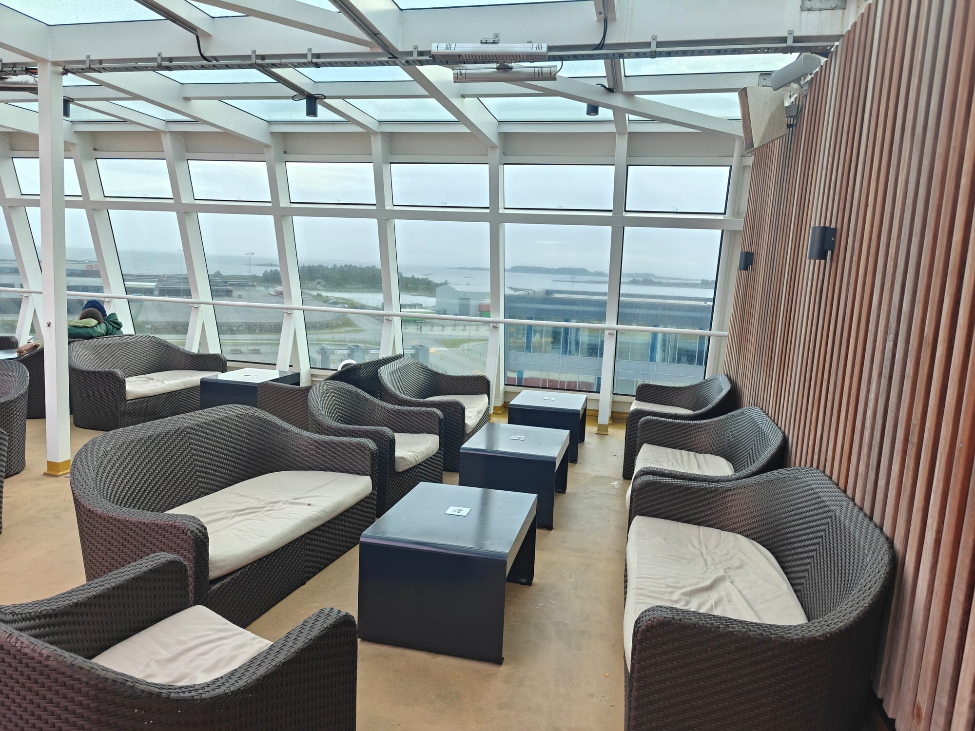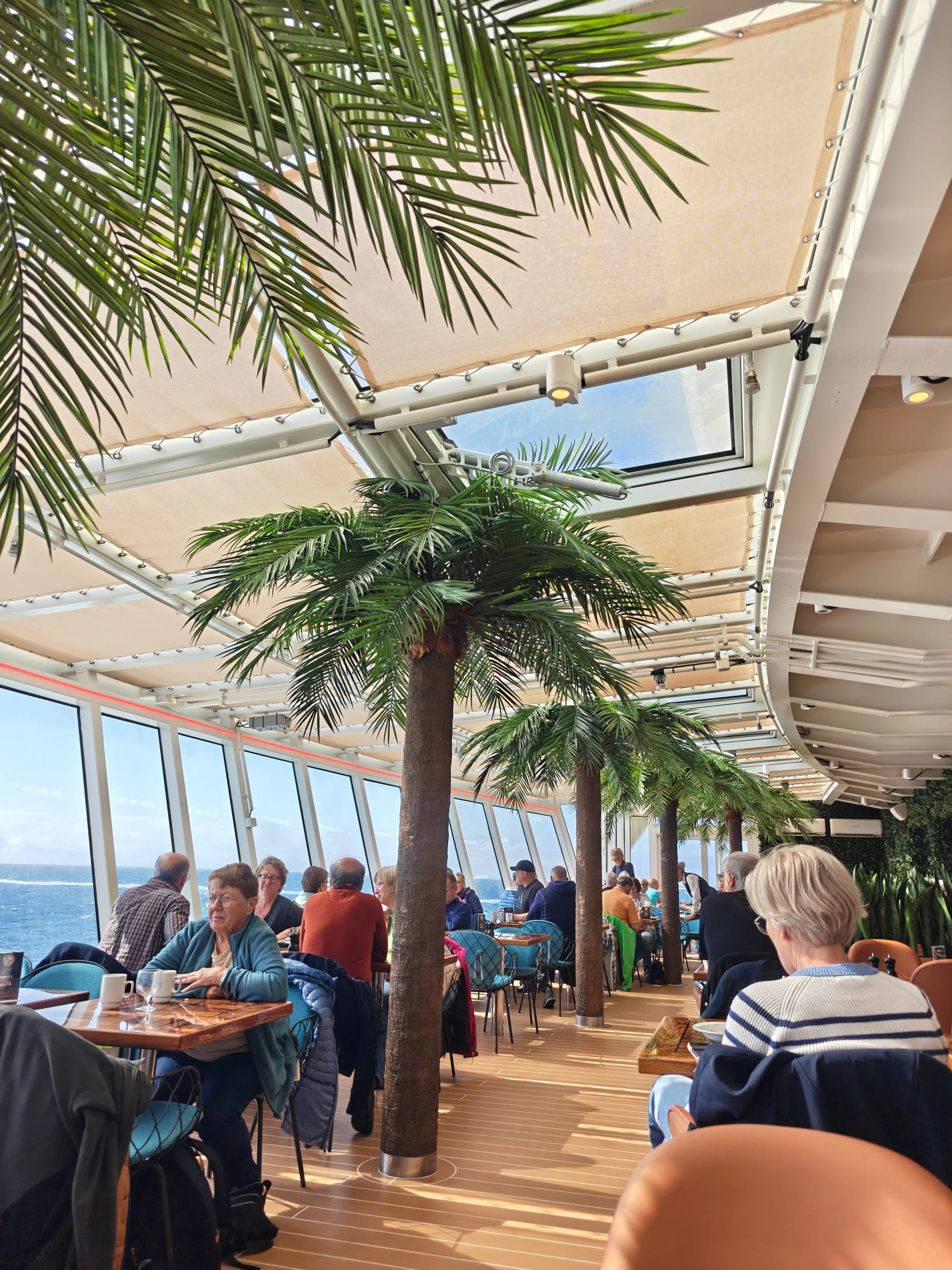 Det er også er nok den beste lokasjonen på skipet er. Bakerst i buffet restauranten, kan man gå ut i en vinterhage aktivt området, Her er det god temperatur, lyden av havet og utsikt bakover. Så her er en god plass å sitte hvis man har muligheten til det.