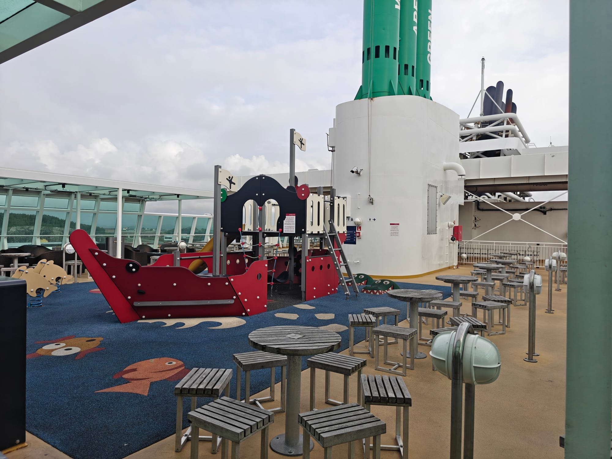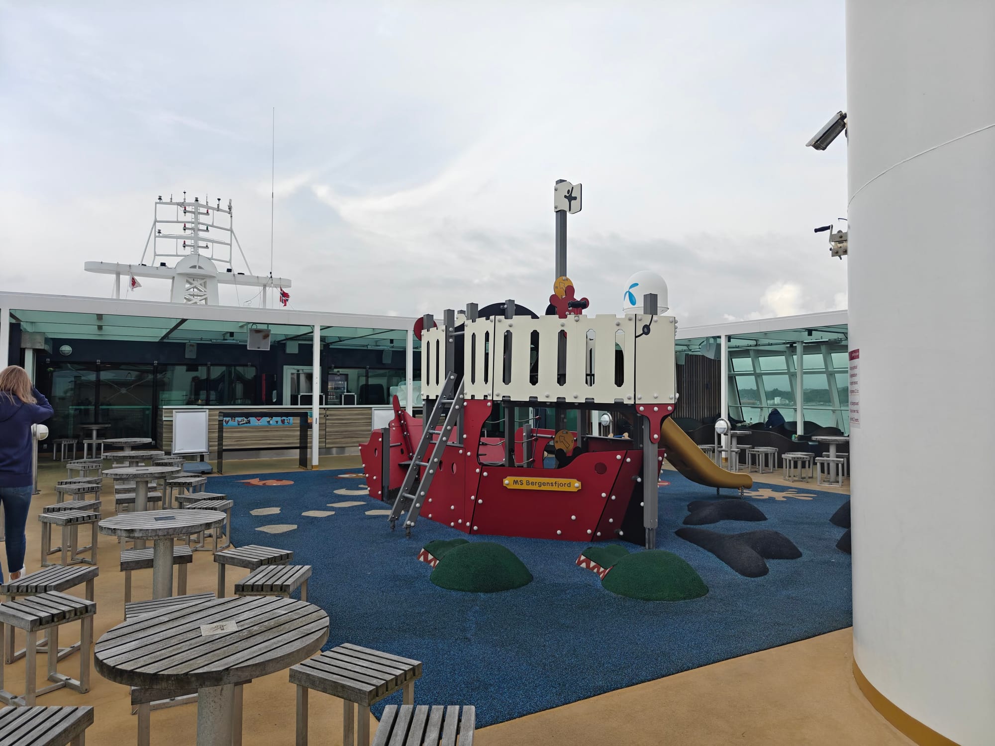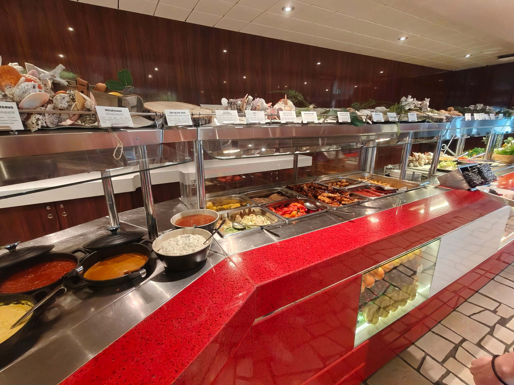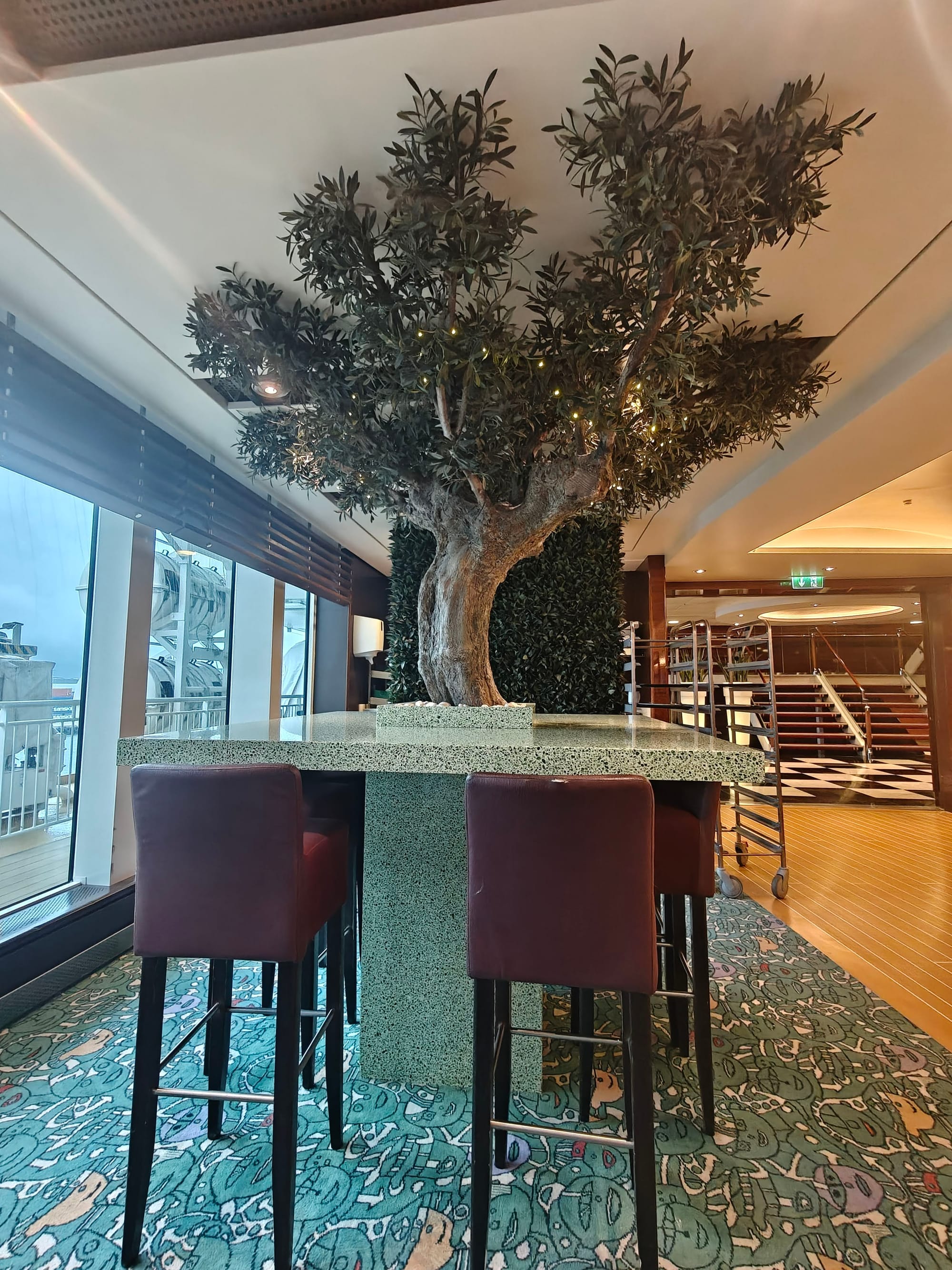 Det er også er nok den beste lokasjonen på skipet er. Bakerst i buffet restauranten, kan man gå ut i en vinterhage aktivt området, Her er det god temperatur, lyden av havet og utsikt bakover. Så her er en god plass å sitte hvis man har muligheten til det.