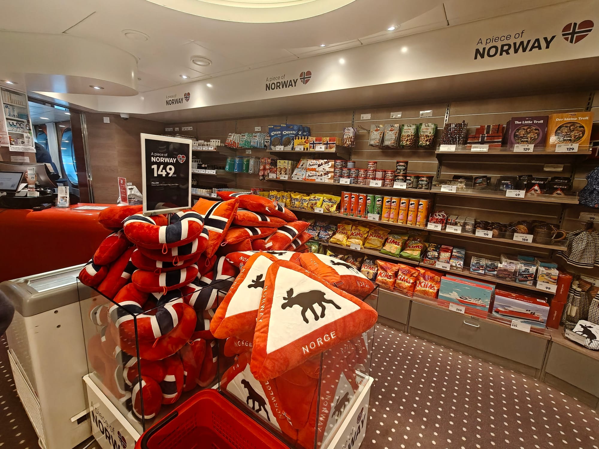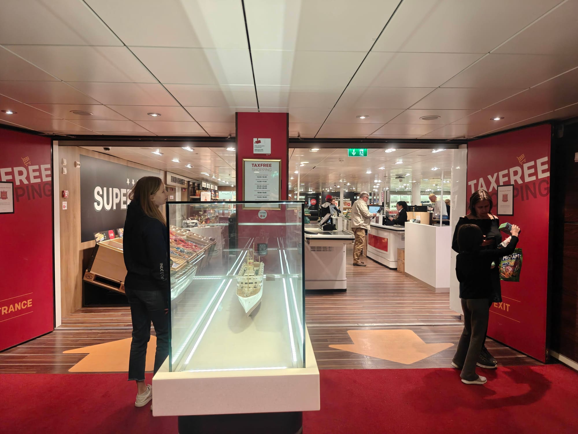- På dekk 6, under buffetrestauranten, ligger den 500 kvm store tax-free butikken med utvalg av alkohol, røyk/snus, parfyme, suvenirer, samt fryse- og kjølevarer. Brus og godteri er også tilgjengelig. Prisene om bord vises i DKK, men selv omregnet til norske kroner (ved å gange med ca. 1,55), er spesielt øl og annen alkohol betydelig billigere enn i Norge.