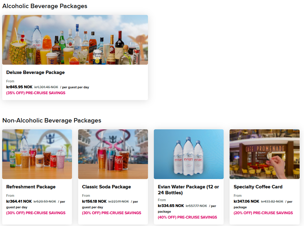 | Deluxe Beverage Package | Ubegrenset alkoholholdige drikker, vin, øl, brus, premium kaffe og te, juice, vann | 845.95 - 1301.46 |