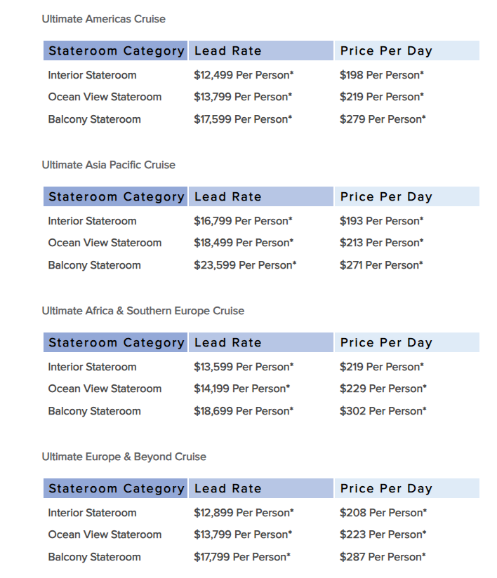 *Taxes, fees, and port expenses of $4,667 USD per person are additional and are subject to change at any time. All starting prices listed are per person, in USD, cruise only, based on double occupancy and are subject to change at any time.